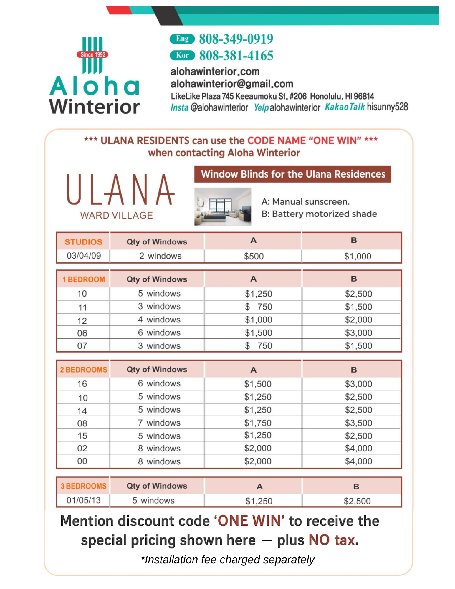 As part of our partnership, Aloha Winterior is extending exclusive pricing to ONE Pacific Realty clients.
