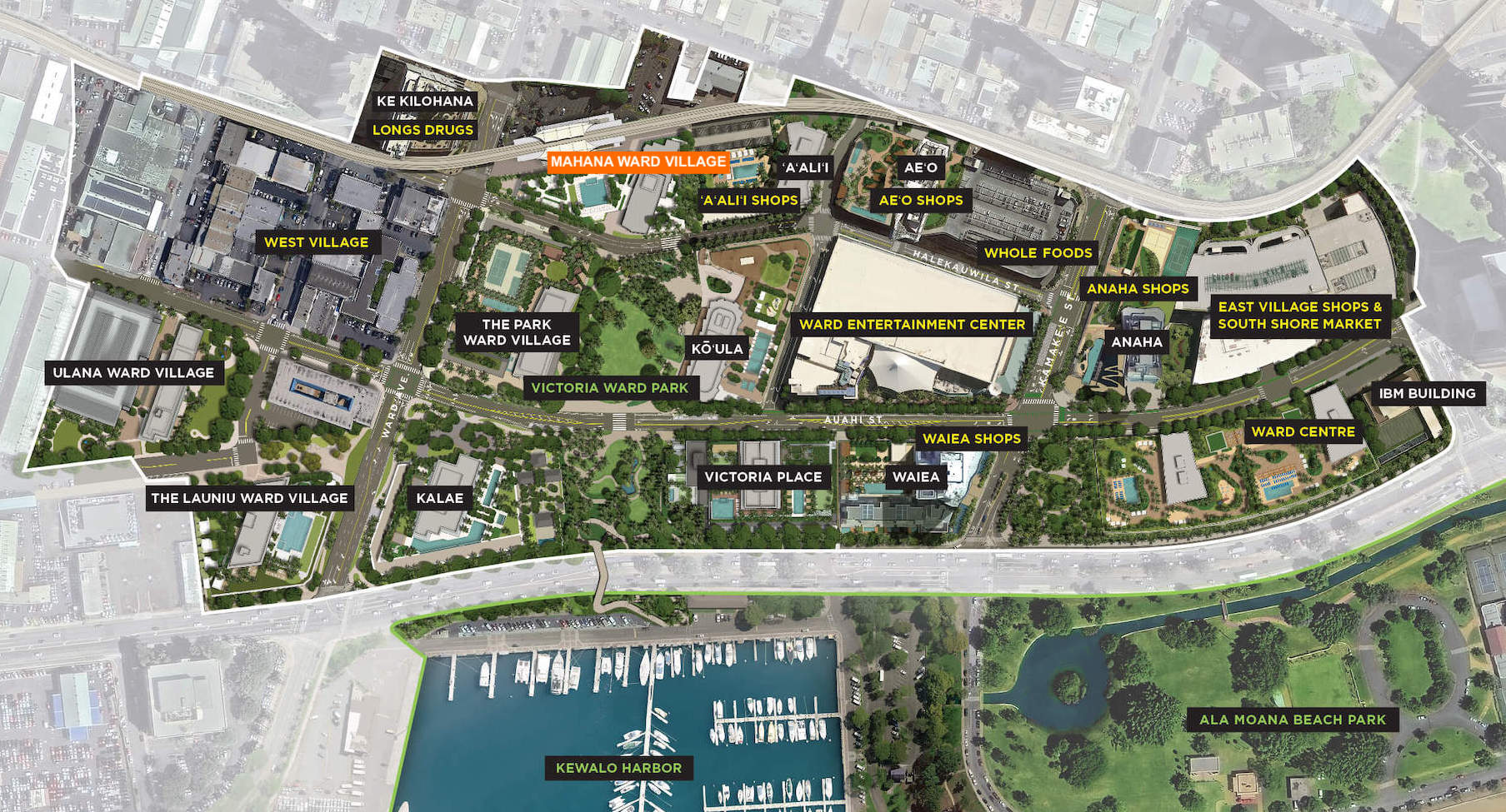 COMING SOON : Mahana Ward Village is Howard Hughes Corp's 12th tower in Ward Village, to be situated between Queen Street and Halekauwila, Ewa of 'A'ali'i, Diamond Head of Ward Avenue and Mauka of Victoria Ward Park. Mahana Ward Village will consist of 340 homes, 47,900 square feet of recreational area, and 16,926 square feet of ground floor commercial space.